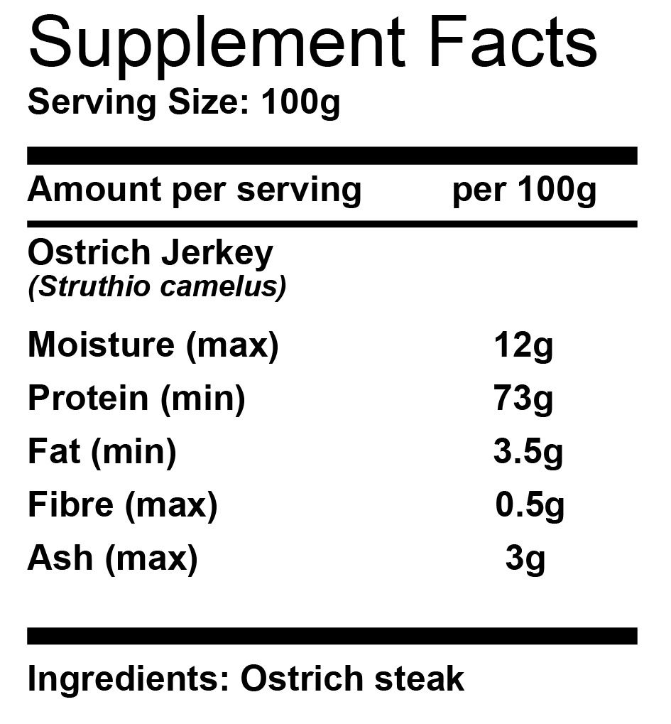 A delicious, all-natural, 100% ostrich meat between-meal snack for your pet in a conveniently portable pack! These delectable, energy-providing snack packs are great for giving your pet a boost when on the go, out and about, or between meals. Suitable for all breeds of dogs and cats. Ideal pet snack or treat. The perfect treat to say I love you.